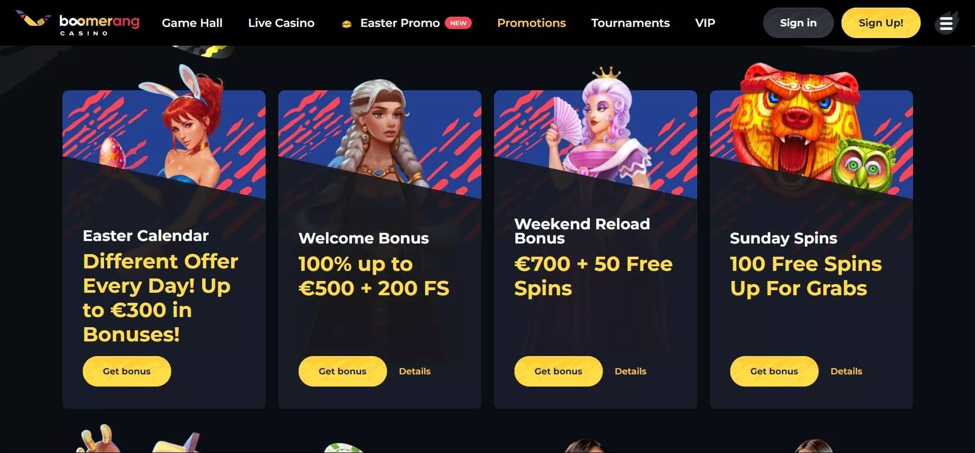 Boomerang casino posjeduje impresivnu ponudu igara na sreću koje zadovoljavaju ukuse svih igrača. Na raspolaganju su vam uvijek popularni slotovi s različitim temama, klasične casino igre, kao što su blackjack, poker, rulet, baccarat, kao i mnoge druge uzbudljive igre. Bez obzira jeste li početnik ili iskusni igrač, Boomerang Casino ima nešto što će zadovoljiti čak i najistančanije ukuse.