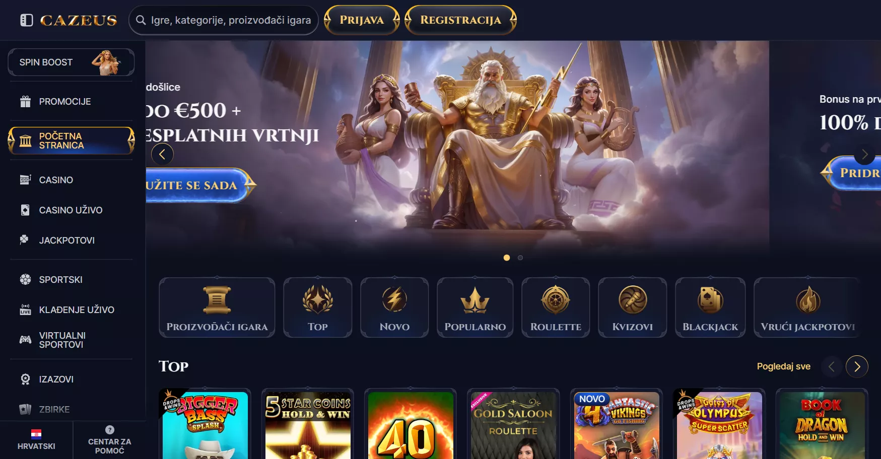 Slotovi, igre uživo, kartaške igre, stolne igre, jackpoti, brze igre