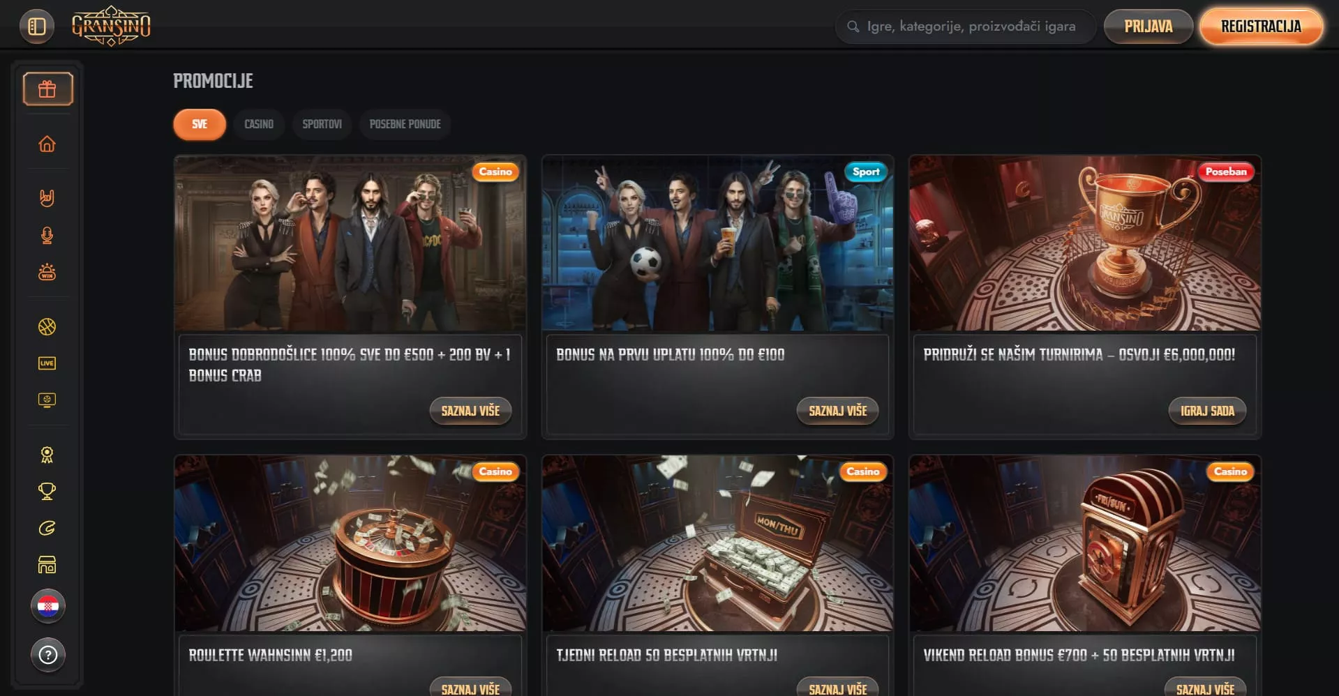 Službena stranica kockarnice donosi popriličan asortiman bonusa i promocija. Iako se radi o sasvim novom operateru s brojnim ponudama, jasno je kako do kraja godine možete očekivati još novih bonusa u Gransino Casinu u Hrvatskoj.