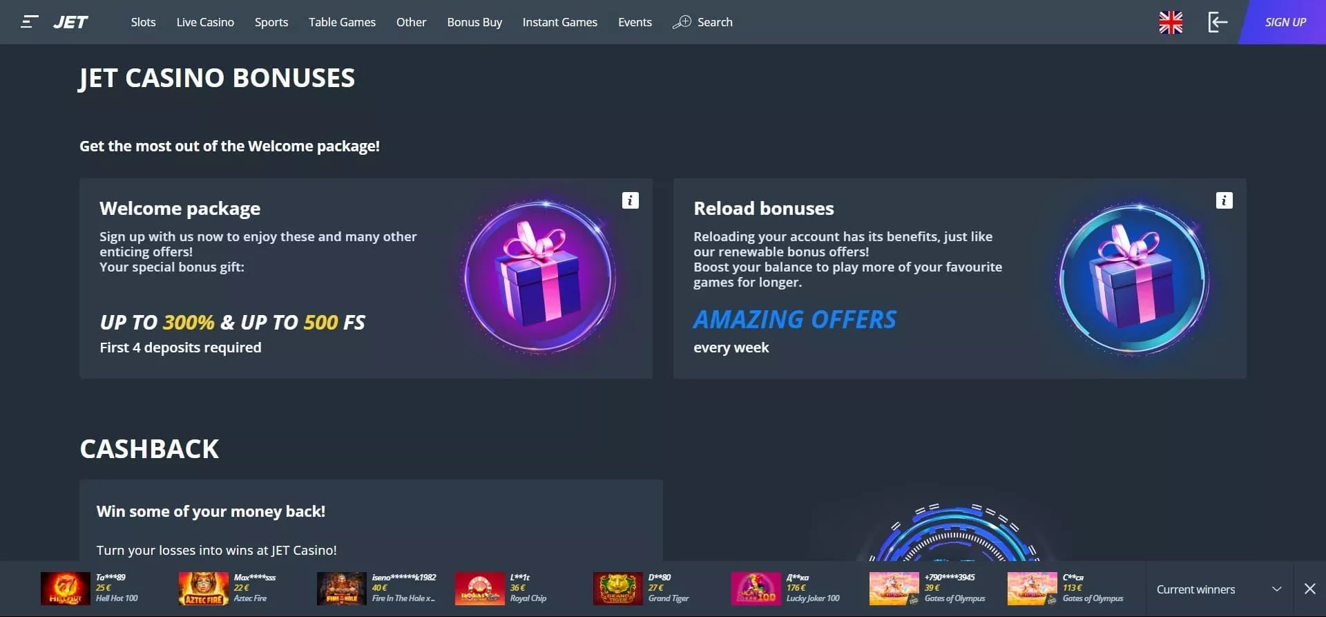 Jet Casino nudi igračima razne tekuće bonus ponude uz ponudu povrata novca. Ovi bonusi imaju za cilj poboljšati vaše iskustvo igranja i povećati vjerojatnost dobitka. Štoviše, Jet Casino ima posebno bonus područje na vašem računu gdje možete otkriti jedinstvene bonuse koji vam se daju izravno. Ovi personalizirani bonusi prilagođeni su vašim preferencijama i igračkim navikama, što rezultira jedinstvenim iskustvom igranja.