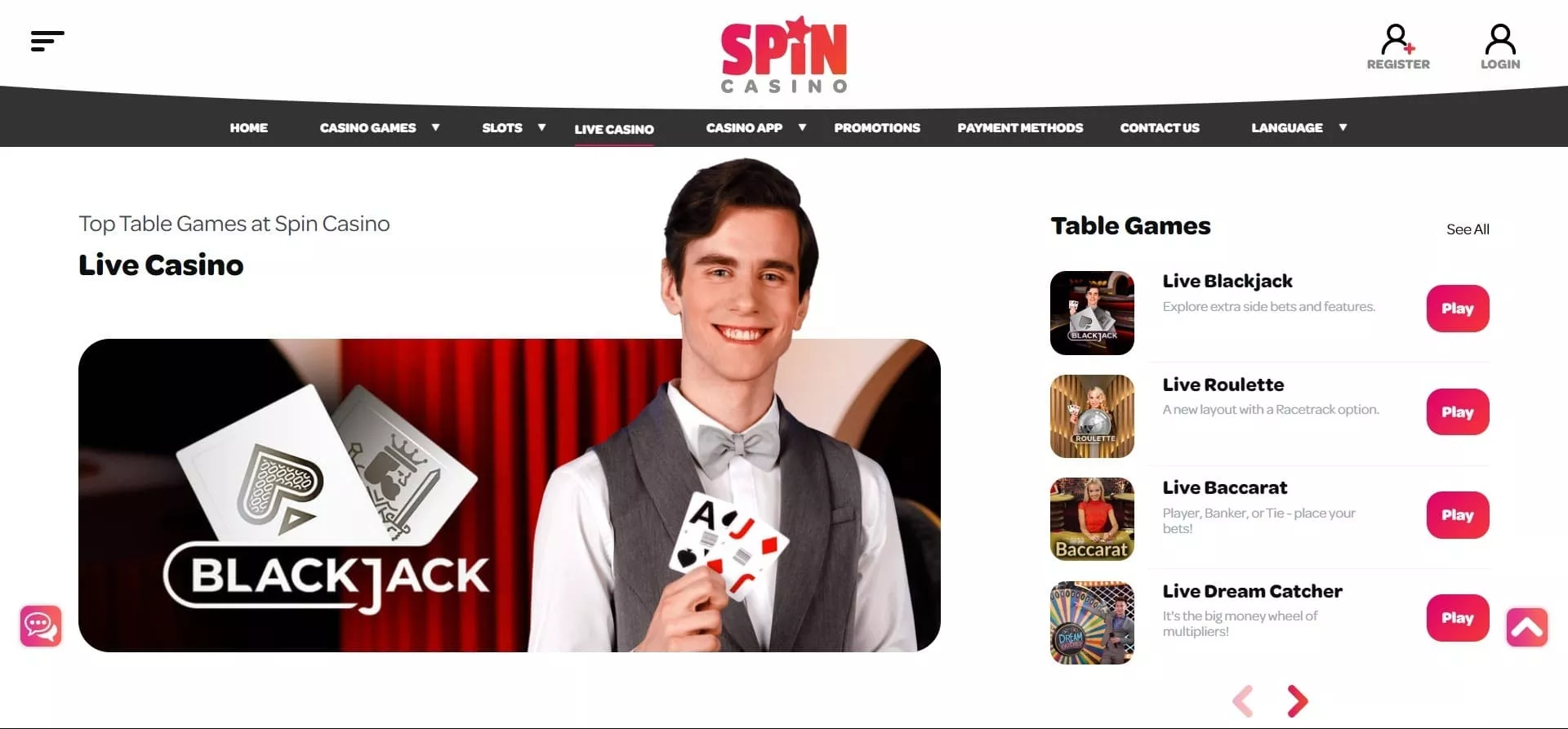 Casino Spin nudi vam stotinjak stolova za kockanje u realnom vremenu, a među ponuđenim igrama dominira blackjack. Ova kartaška igra pojavljuje se u brojnim verzijama, s umjerenim minimalnim ulogom, kao i vrlo visokim limitima kockanja.