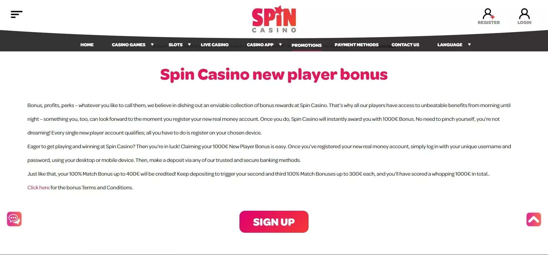 Jedan od glavnih razloga rasta zanimanja za casino Spin definitivno je njegov bonus dobrodošlice, u maksimalnoj vrijednosti do čak 1000 eura. Radi se o sredstvima koja možete uzeti pri vaša prva tri depozita, a iako su uvjeti reinvesticije prilično izazovni, svejedno je uzbudljivo dobiti toliku količinu gratis sredstava odmah nakon registracije.